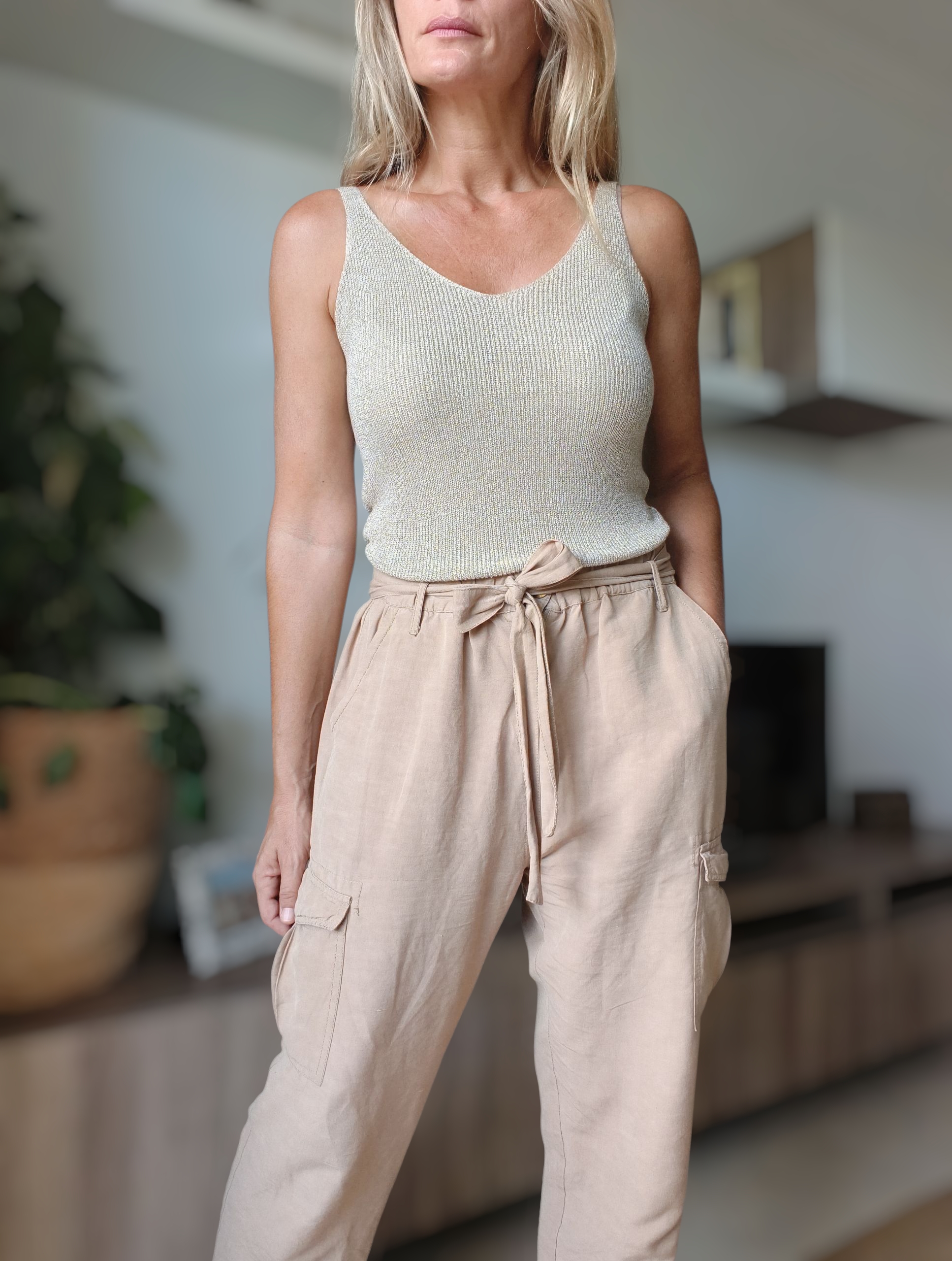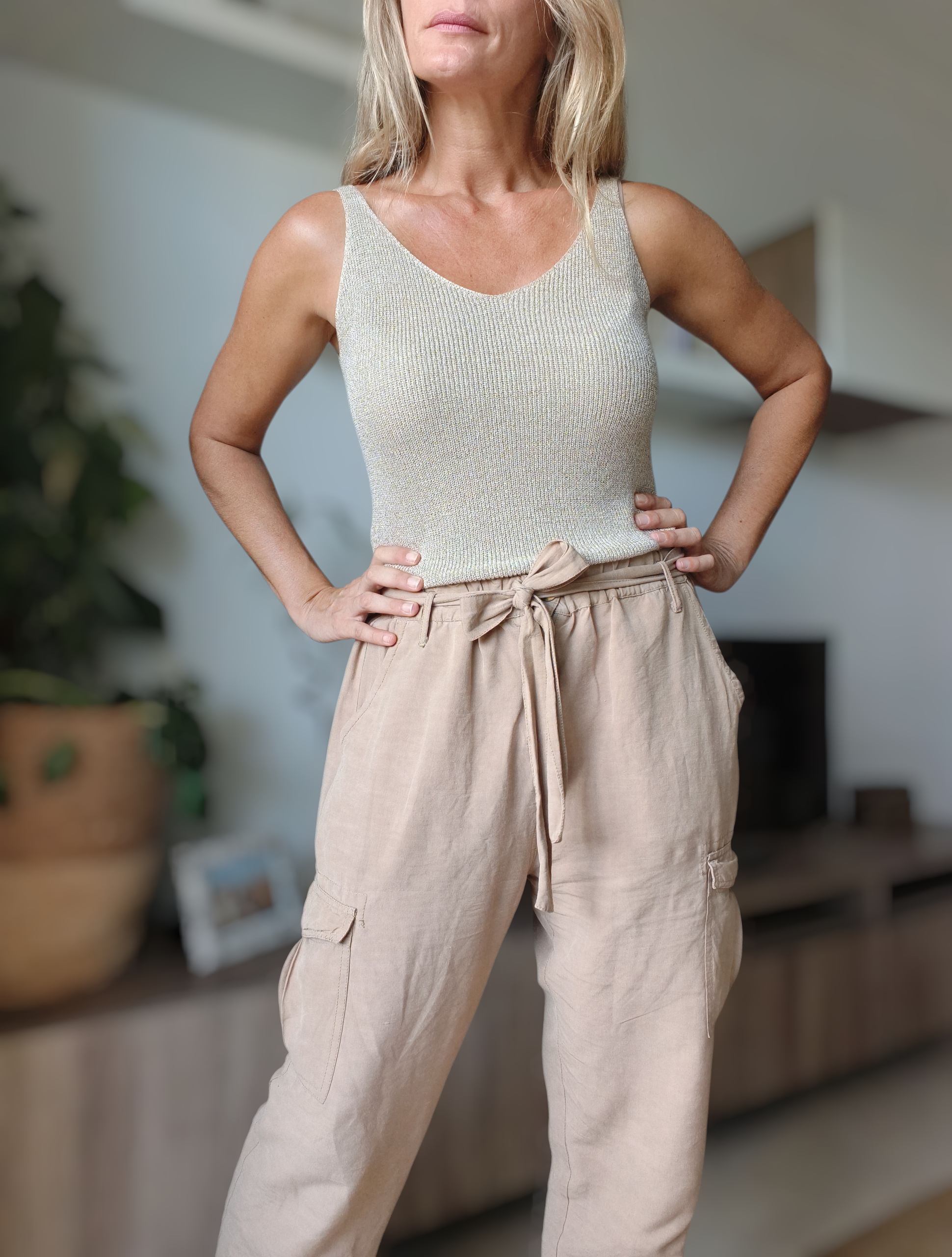 Composición: 62% viscosa, 28% poliéster, 5% lurex, 5% elastan.